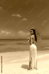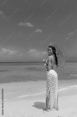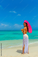 Girl at the beach, standing on the seashore holding pink umbrella, interracial, black