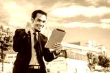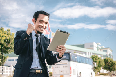 Businessman hold tablet happy success in business investment trade stock market
