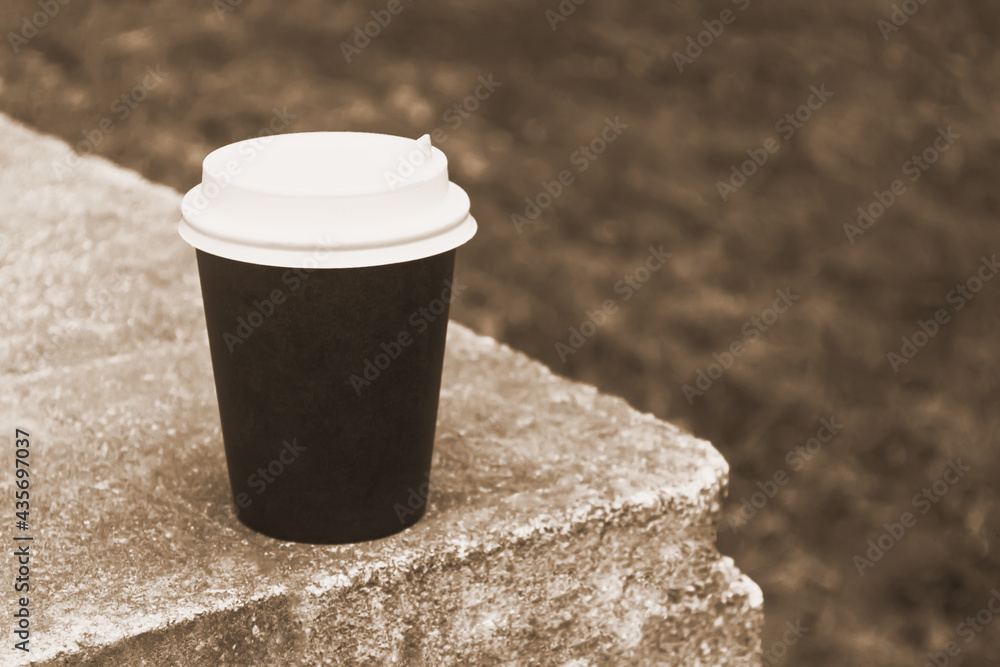 A cardboard cup of coffee sits on a stone curb. Take coffee outside.