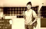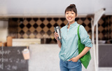 sustainability and people concept - asian woman with thermo cup for hot drinks and green reusable bag for food shopping over food truck background