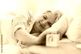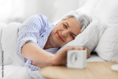 old age and people concept - happy smiling senior woman with alarm clock lying in bed at home bedroom
