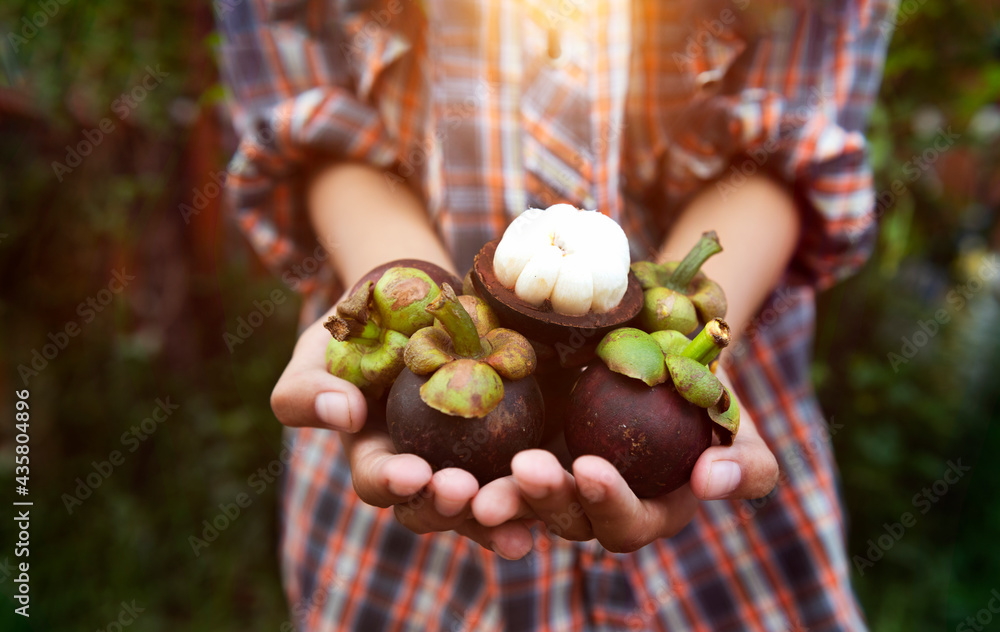 An Asian farmer woman holding a mangosteen crate under the mangosteen tree.