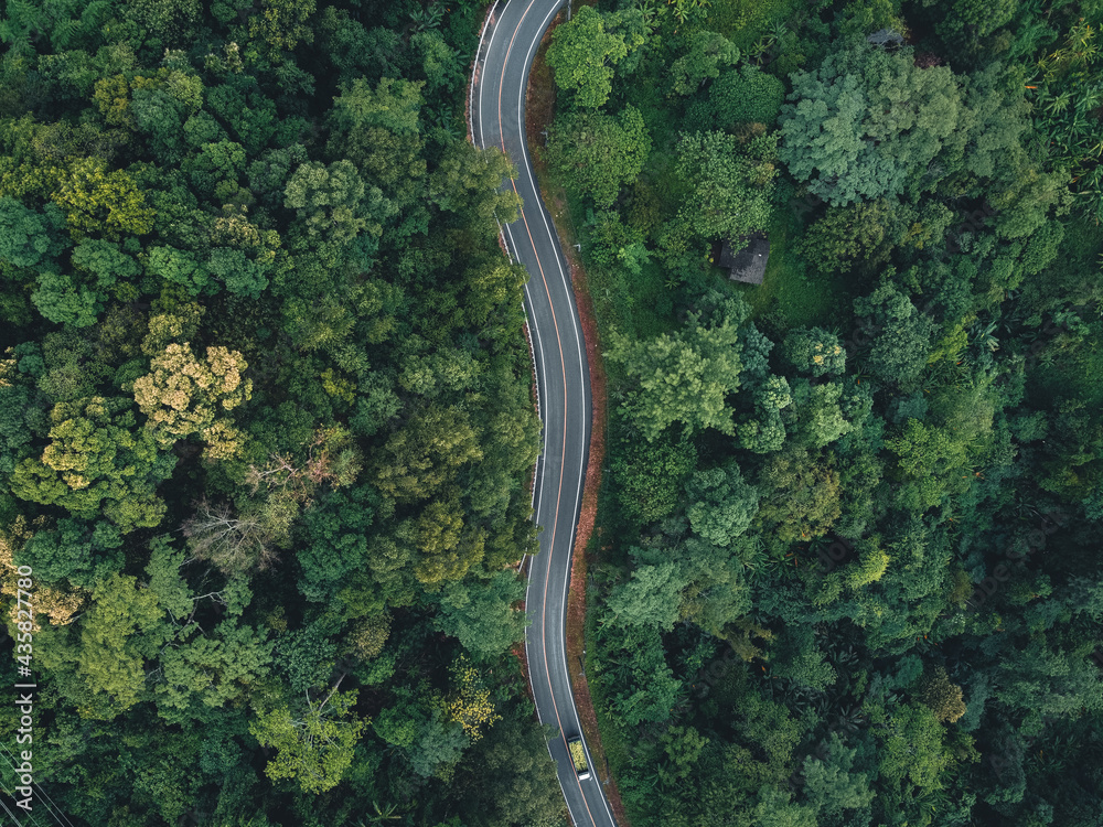 Green road up the mountain in the rainy season The road in the forest