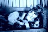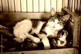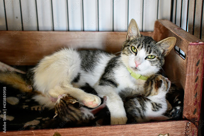 A closeup shot of a beautiful striped cat with kittens in a bed