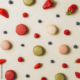 Pattern with creamy and crispy macarons, strawberries, blueberries, and raspberries isolated on a pastel beige background. Creative food concept. Flat lay, top view.