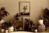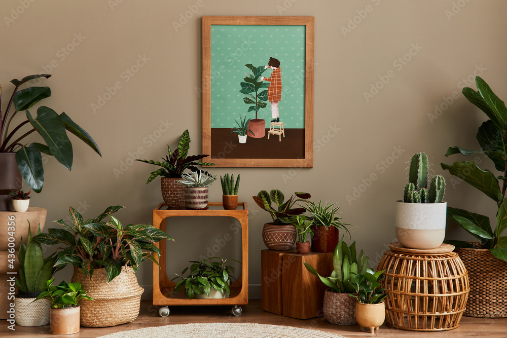 Stylish botany composition of home garden interior with wooden mock up poster frame, filled a lot of beautiful house plants, cacti, succulents in different design pots and floral accessories. Template