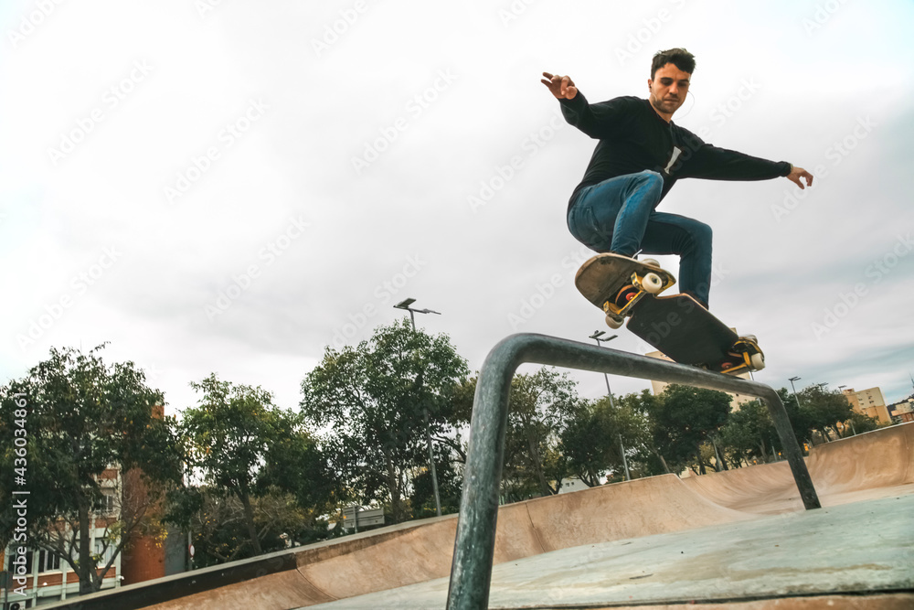 a boy grinding a railing with his snakeboard in an urban outdoor space with copyspace in the background