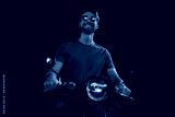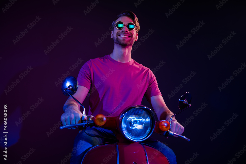 Portrait of attractive cheerful guy riding bike traveling pastime tour isolated over dark neon purple color background