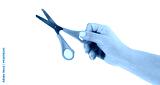 hand picking up green scissors on white background