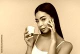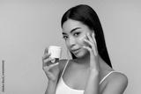Young Asian woman with clean radiant skin uses a moisturizing face cream on a beige background. Spa care, facial skin care, beauty cosmetology.