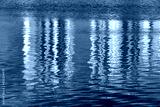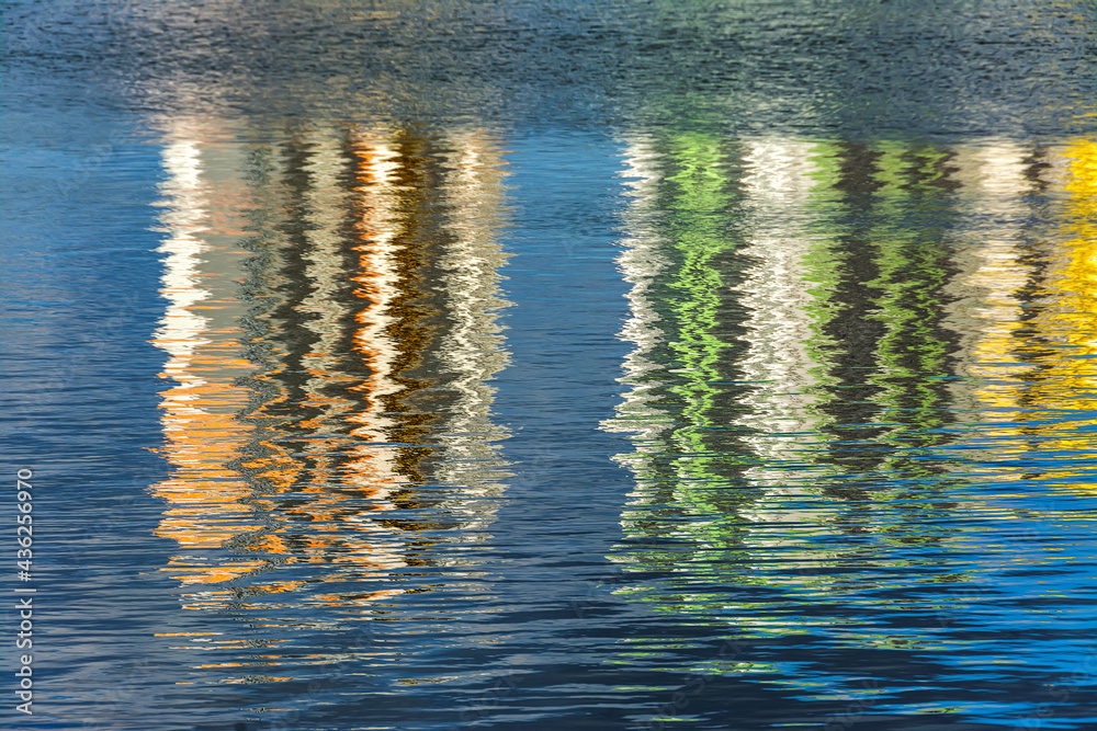 Reflection of high-rise buildings in the water of the pond in windy weather.
