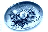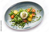 Mozzarella ball and vegetable salad on a blue plate