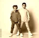 Studio portrait of a cool little boy and girl dressed in stylish bright sports suits with sweatshirts and pants on a white background. Children's sports style concept. Banner.