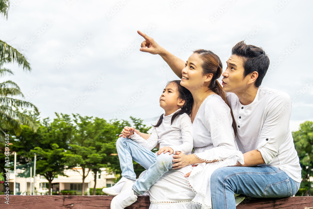 Happy family spending time together in the park, Beautiful asian family sitting on a chair in the park, pointing at something and looking up while picnicking with her family .