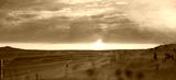Arctic landscape in winter time. Grass with ice and snow in tundra. Sunset.
