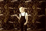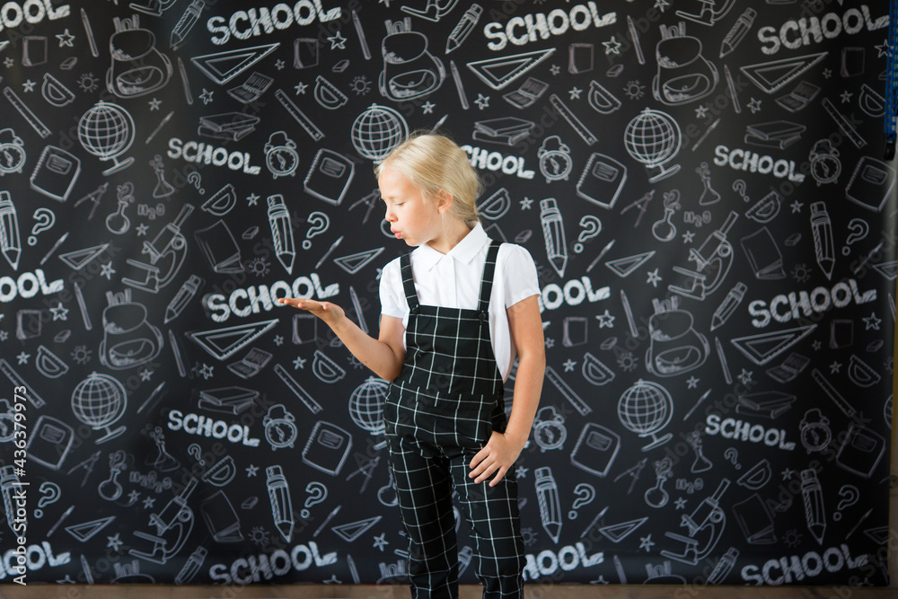 interesting smiling little girl in school clothes against a school board with drawings on the theme of School. School concept. Back to school.