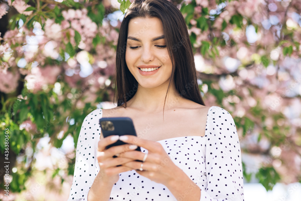 Smiling woman walks down the central park city street and uses her phone. Pretty summer woman in white dress walks down the street looking at her mobile phone