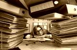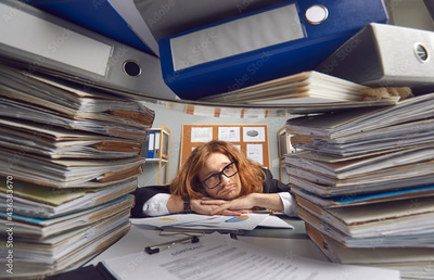 Indifferent unmotivated tired office worker sitting at desk with lots of corporate bookkeeping paperwork. Sad bored lacking energy unsatisfied accountant dreaming of day off, weekend or holiday