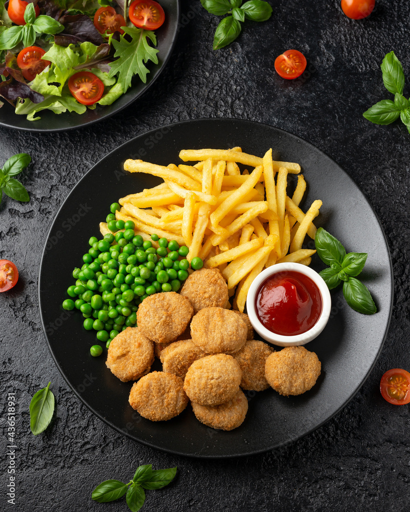 Fried crispy chicken nuggets with ketchup, french fries and green peas in black plate