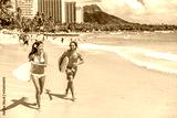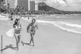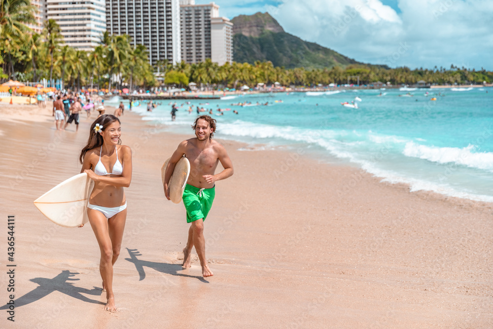 Hawaii surf lifestyle couple of surfers going surfing in Waikiki beach, Honolulu, Oahu island. USA travel. Fun summer tourist vacation destination activity.