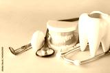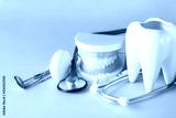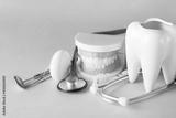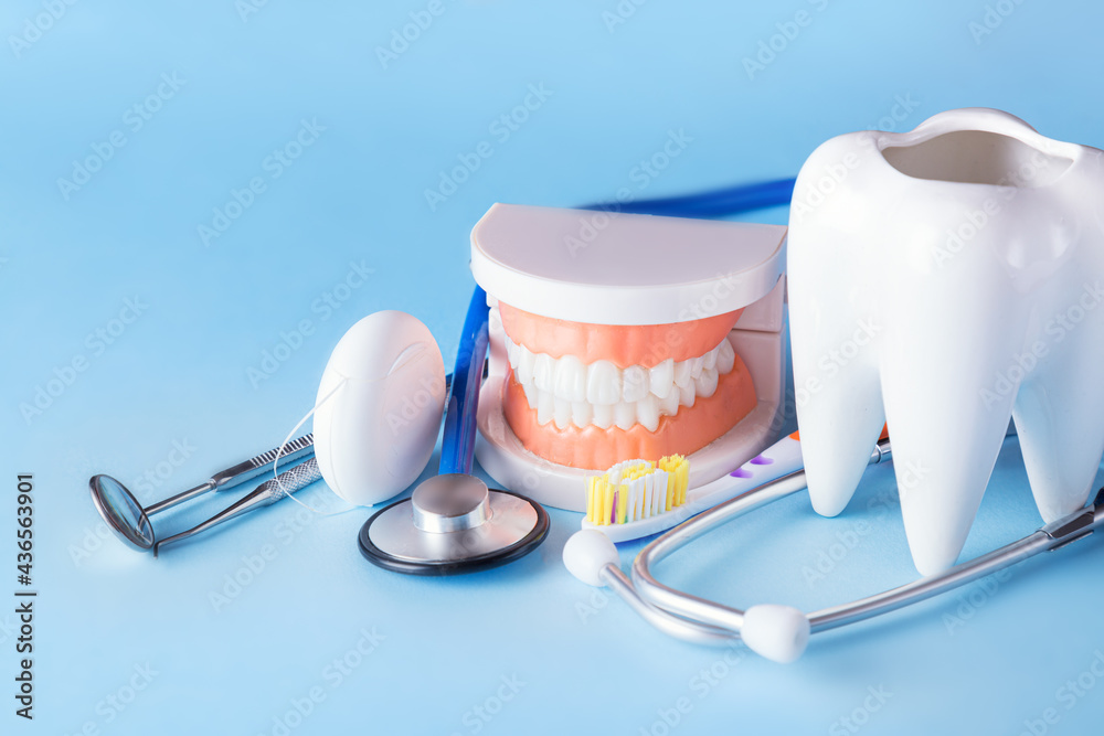 Dental health and teethcare concept. Dental mirror with explorer probe, toothbrush, floss, human jaw model and white tooth with stethoscope on blue background