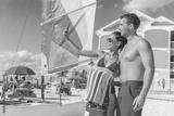Happy summer couple taking selfie on Florida beach on travel vacation. Sunbathing woman in bikini using phone with man friend.