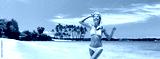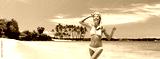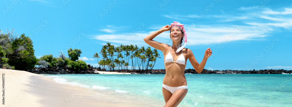 Hawaii beach vacation snorkel active happy Asian bikini girl coming out of swimming in ocean snorkeling fun. Panoramic banner with lava background.