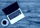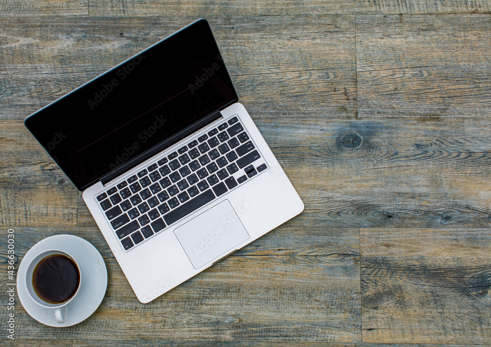 Top view of laptop notebook computer with black coffee in white cup on wooden pattern background with copy space