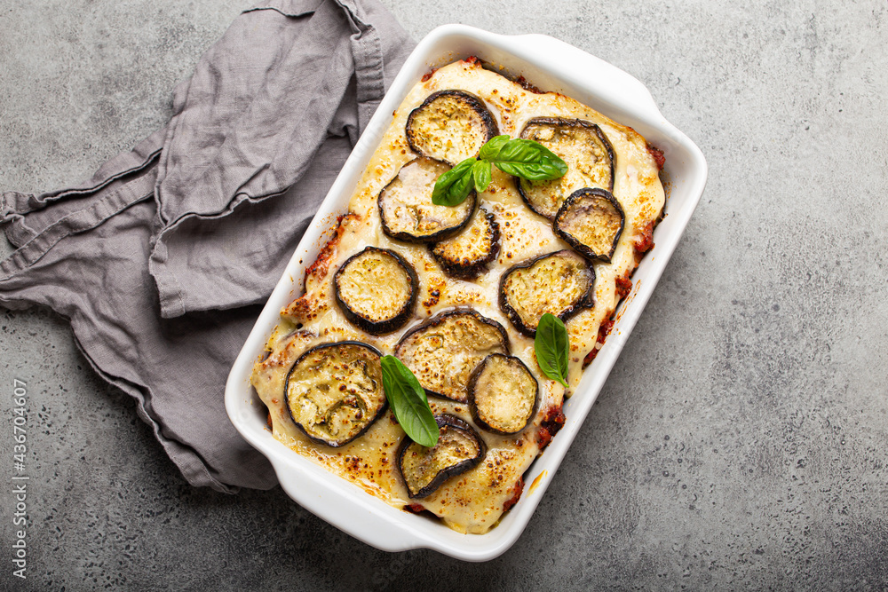 Greek mediterranean dish Moussaka with baked eggplants, ground beef in white ceramic casserole on rustic stone background from above, traditional dish of Greece