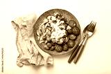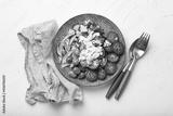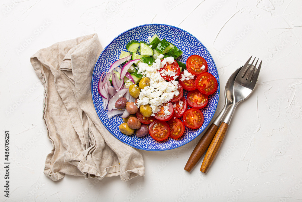Greek mediterranean salad with tomatoes, feta cheese, cucumber, whole olives and red onion in ceramic plate on white stone background from above, traditional appetizer of Greece