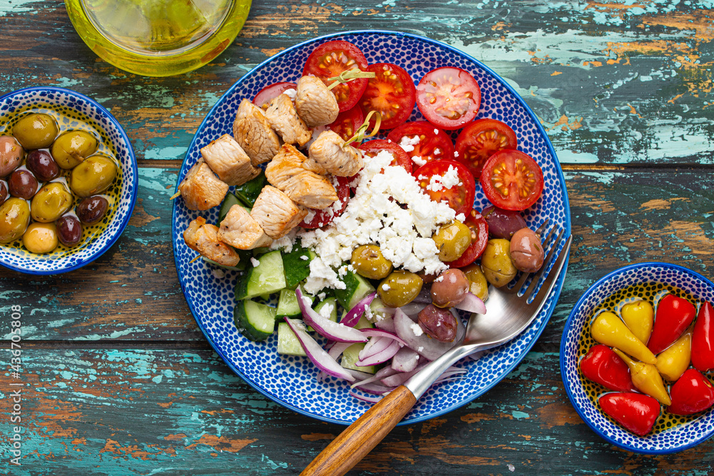 Greek meat souvlaki and mediterranean salad with vegetables, feta cheese on plate on rustic wooden background from above, with olive oil in bottle and assorted traditional appetizers of Greece