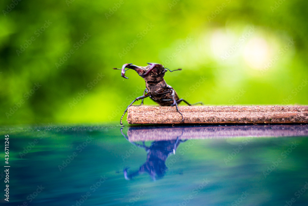 Stag beetle. Lucanus cervus. Listed in the red book. Beetle in a fighting stance