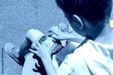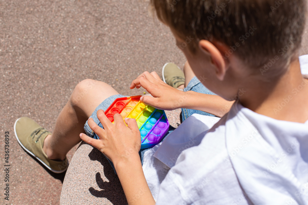Boy playing with rainbow anti stress pop it toy, outdoors