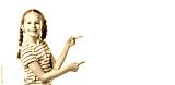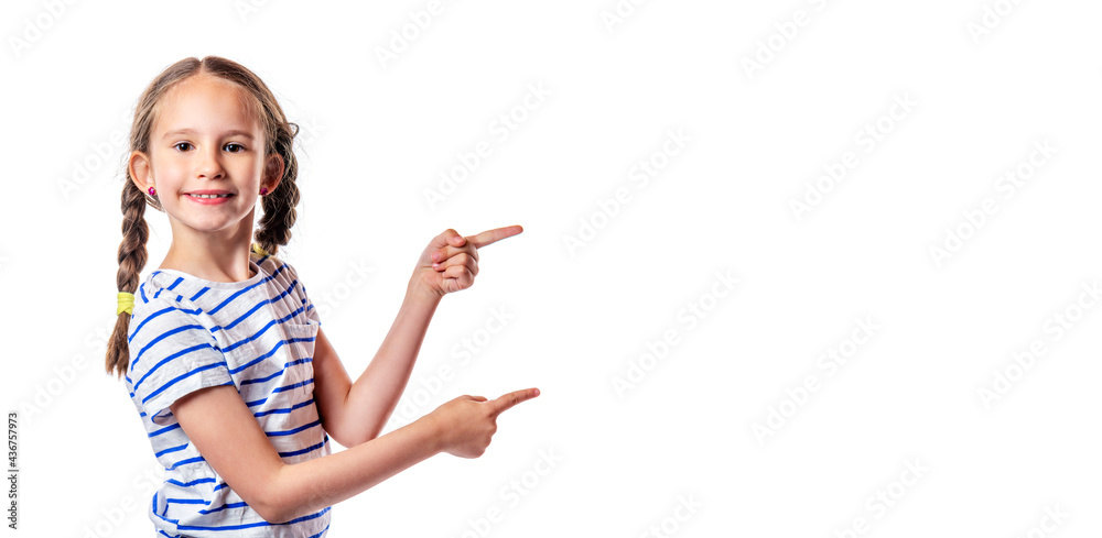 Cute european smiling little girl with pigtails pointing fingers isolated on white background. Free space for your text. Marketing and advertising concept.
