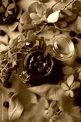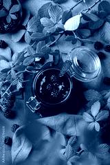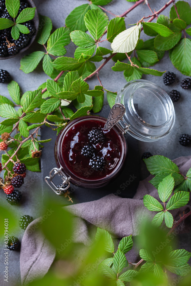 Homemade blackberry jam or confiture, cooking, preserving at home