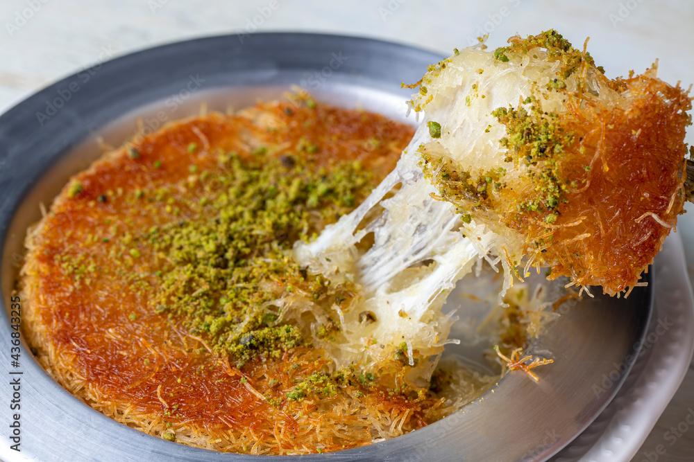 Delicious traditional Turkish kunefe with pistachio on it. Served hot and with syrup