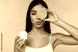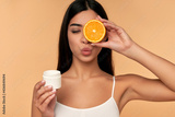 Portrait of Asian young girl holding orange and moisturizing face cream isolated on beige background. Facial skin care concept, natural cosmetics.