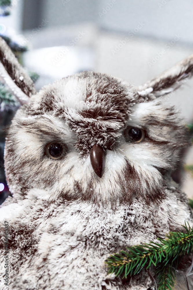 New year christmas festive background, decorative toy fluffy owl and illumination in fir branches