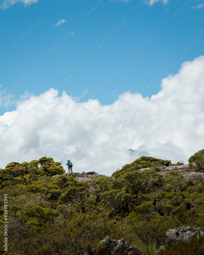 A man hiking on top of the Key Summit with mountains covered in white clouds, Routeburn Track, South Island. Vertical format