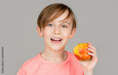 Little boy eating apple. Boy apples showing. Child with apples. Portrait of cute little kid holding an apple. Baby boy eating apple and smiling. Boy smiles and has healthy white teeth