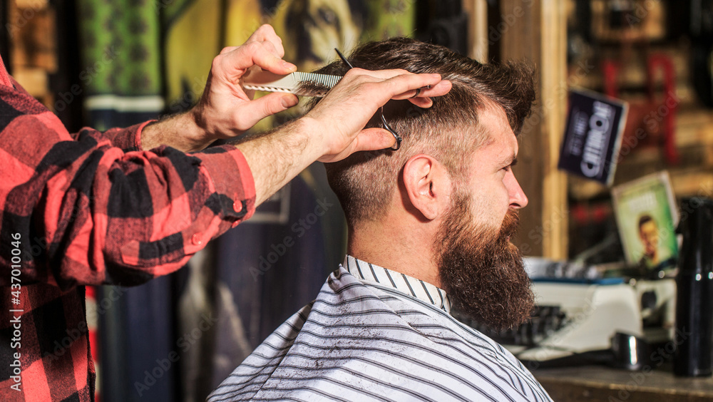 Bearded man in barber shop. Work in the barber shop. Man hairstylist. Hairdresser cutting hair of male client. Man visiting hairstylist in barbershop. Barber scissors