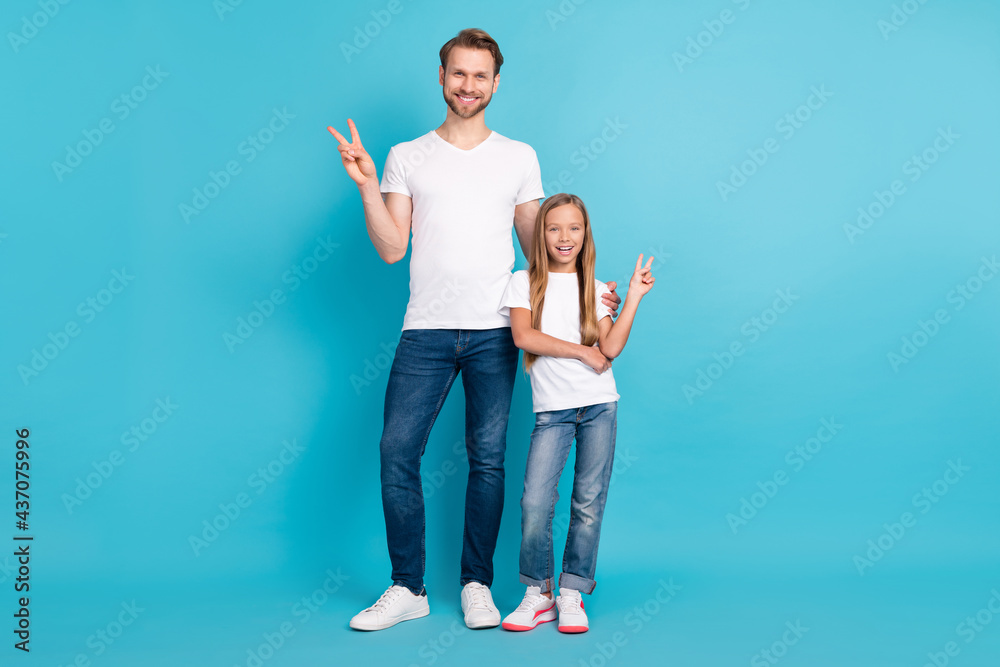 Full size portrait of handsome guy cute girl standing fingers show v-sign isolated on blue color background