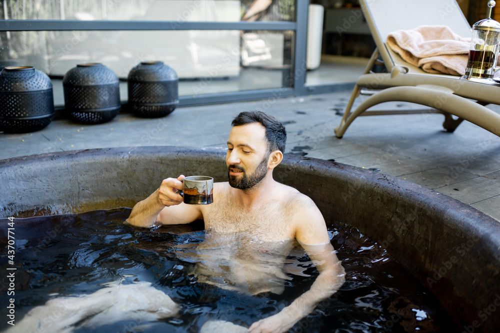 Adult caucasian man relaxing at spa outdoors, lying in a hot vat and drinking tea. Bathing and recreation in Spa