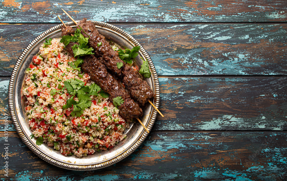 Middle eastern Turkish dinner with meat kebab and couscous salad tabbouleh on rustic metal plate on wooden background top view with copy space, traditional Arab meal