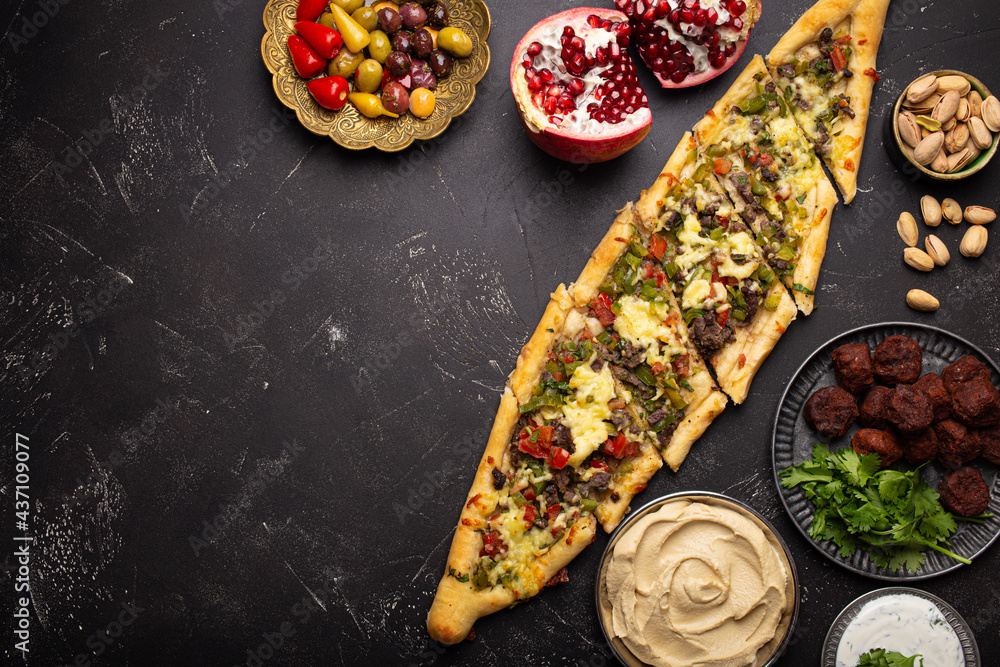 Various Turkish dishes: pide pizza, meat kebab with tabbouleh salad, falafel, hummus, olives and Middle Eastern meze on black table top view with copy space. Ethnic arab food, cuisine of Turkey