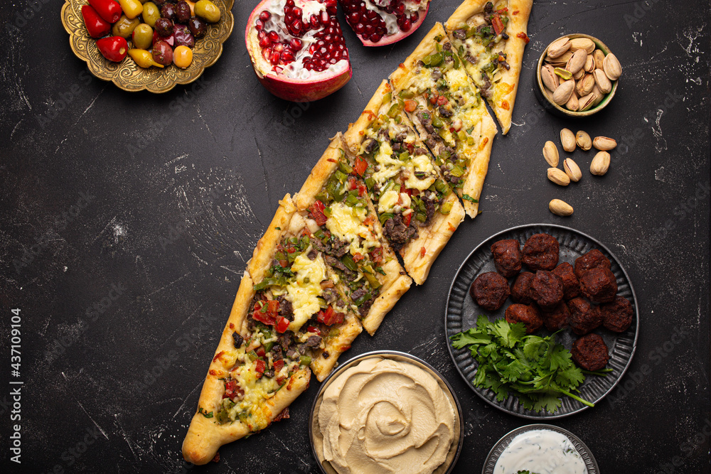 Various Turkish dishes: pide pizza, meat kebab with tabbouleh salad, falafel, hummus, olives and Middle Eastern meze on black table top view with copy space. Ethnic arab food, cuisine of Turkey
