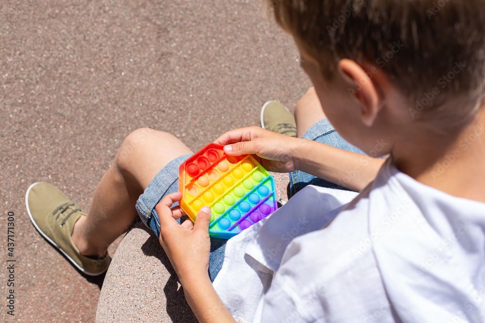 Boy playing with rainbow anti stress pop it toy, outdoors