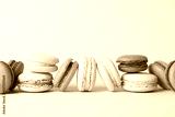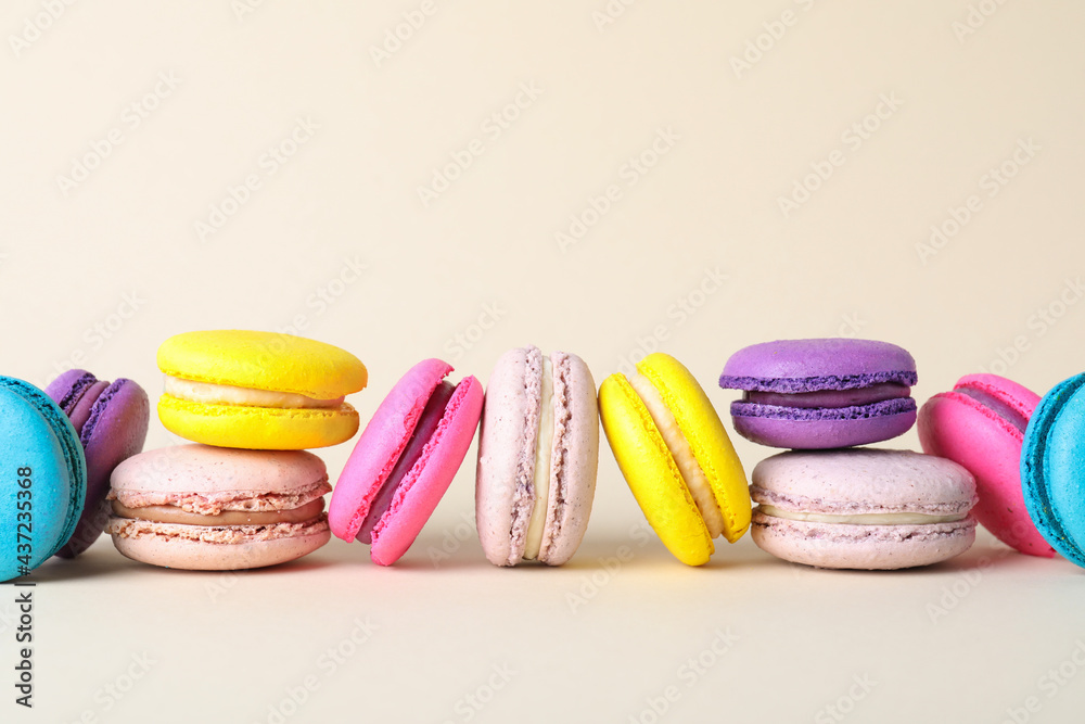 Delicious fresh colorful macarons on beige background