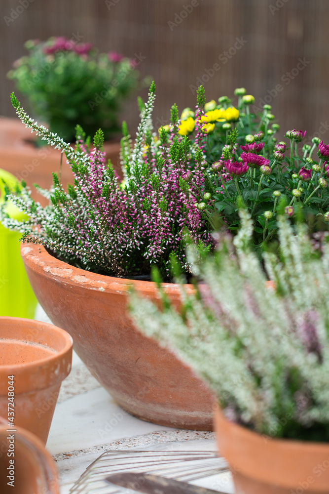 Terracotta pots with autumn flowers, outdoor composition