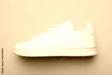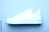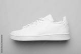 Casual shoes on yellow background. Top view of stylish sneakers on color background